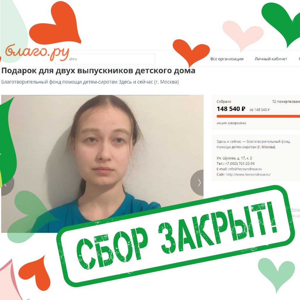 На платформе Благо.ру (https://blago.ru/actions/view/536) — завершился сбор «Подарок для двух выпускников детского дома».