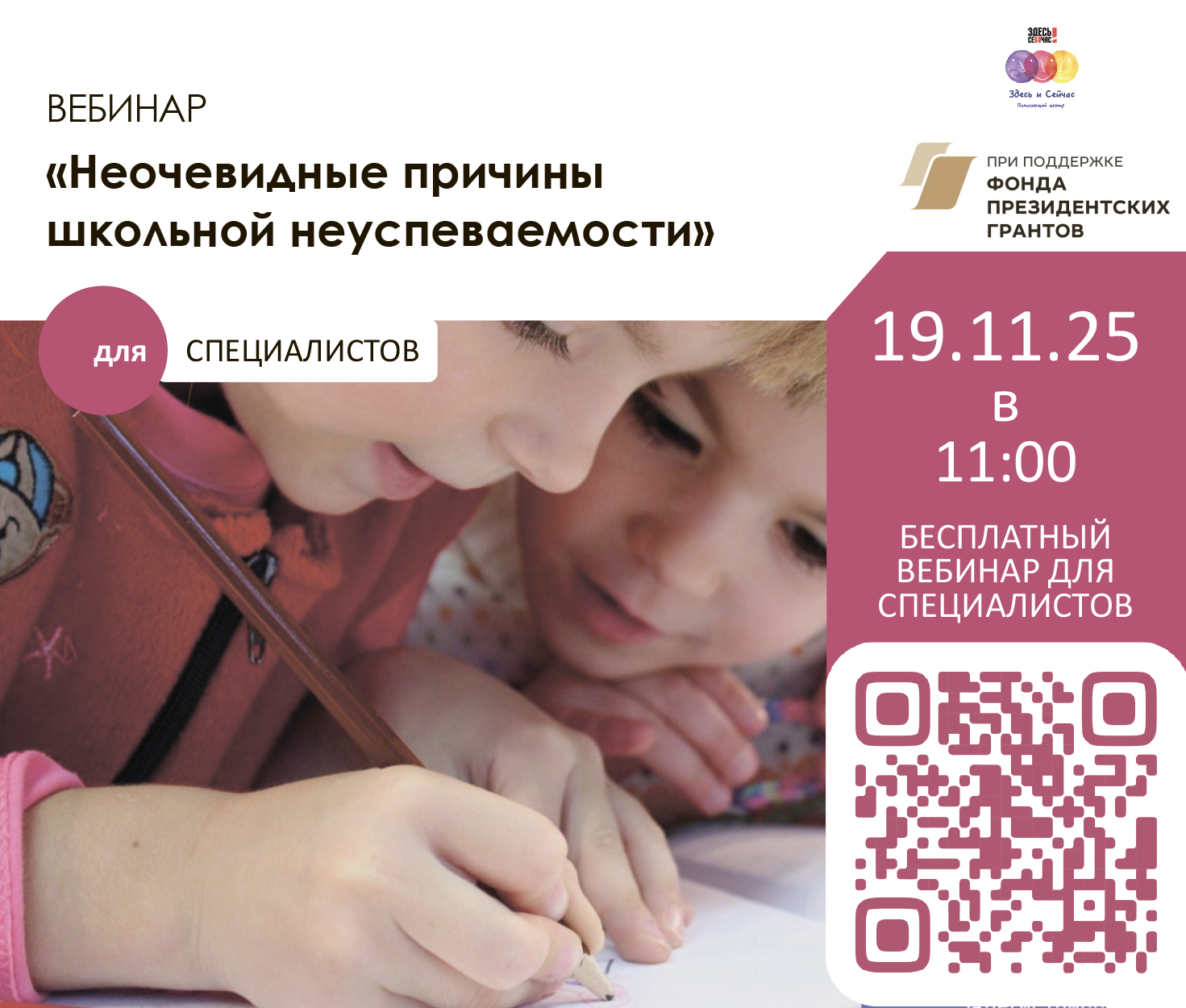 "Здесь и сейчас" приглашает специалистов сферы семейного устройства на вебинар «Неочевидные причины школьной неуспеваемости». (https://zdes-i-seychas-fond.timepad.ru/event/3664780/)