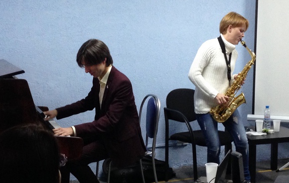 Дирижер Григорий Королев и саксофонистка Вероника Кожухарова выступили перед детьми и родителями, о чем рассказывает руководитель Ресурсного центра Наталья Степина:
