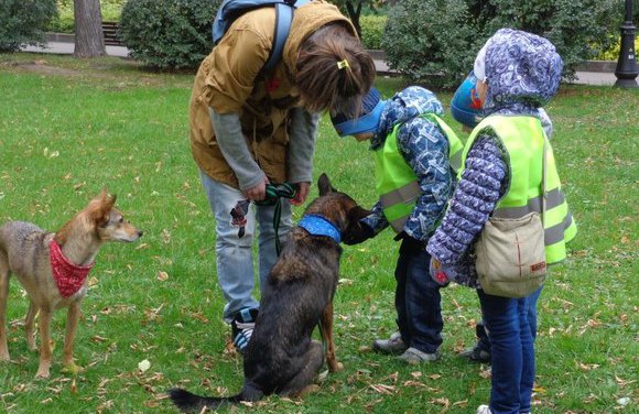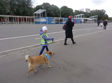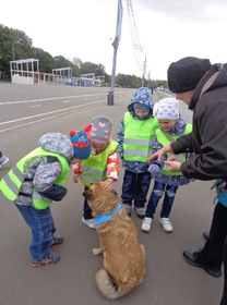 Во вторник отправились на встречу с собаками-терапевтами в парк культуры и отдыха имени Горького. Чаплин, Рошель, Райли, Гюльчатай радостно встретили малышей. Сначала все познакомились и хозяева собак – Наталья и Мишель –рассказали правила общения со своими питомцами. А затем пошли на полянку, где собаки показывали своё умение: перепрыгивали через детей, пробегали между ног, ловили игрушки и летающие тарелки и даже запрыгивали на деревья! Дети были в восторге.