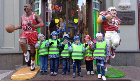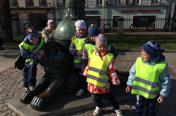 Позавтракали, разместились и пошли погулять на Гоголевский бульвар, где рассматривали памятники и играли на детской площадке, а после и на Арбат, где рассматривали витрины и сказочных героев, которых можно погладить, подержать за меховой палец и взять у них рекламные листовки с яркими картинками, которые так интересно рассматривать.