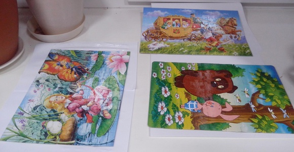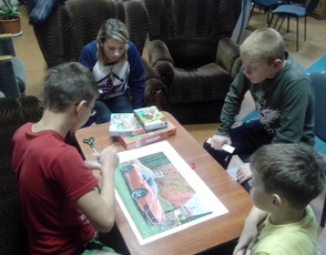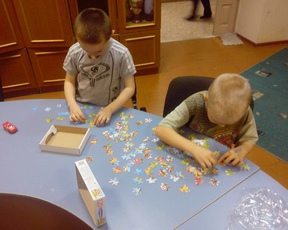 После чая собирали с младшими ребятами пазлы. Малыши собирали маленькие, а взрослые ребята тоже подтянулись и взялись за сборку большого пазла из 500 частей. До ужина всё было собрано и закреплено специальным клеем. Этот процесс особенно понравился малышам.