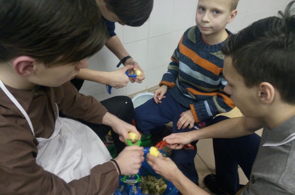 Закупив продукты, взялись за работу, которой было много: мыли, резали, чистили. Парни чистили картошку, девочки мыли овощи и новую посуду. Готовим мы с ребятами в классе кулинарии и поняли, что надо кое-что докупить для хозяйства.