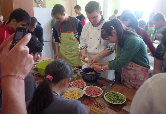 2 мая собрались, как и договаривались, в 9:30, после завтрака. Ещё раз познакомились, рассказали, кому что нравится делать и узнали, что многие ребята любят готовить. Лёша составил с ребятами список блюд, которые они хотели бы приготовить. Итак, сегодня в меню салаты «Оливье» и «Крабовый», «Солянка» и фаршированные блины!