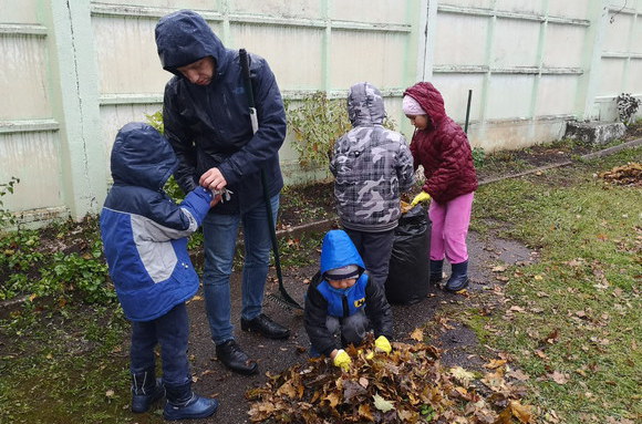 Начали встречу с хозяйственных занятий: одна группа волонтеров мыла окна в учреждении, а другая вместе с ребятней убирала двор.