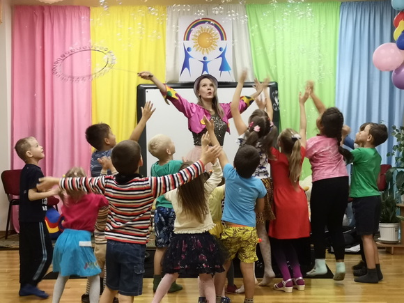 Потрудившись, продолжили общение уже в группах – играли и раскрашивали раскраски. А потом было шоу мыльных пузырей от Любы Руббо, которое вызвало восторг: каждый желающий побывал внутри огромного мыльного пузыря! Еще Люба показала маленьким зрителям чудеса контактного жонглирования и расписала желающих аквагримом.