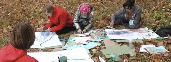 Ну а дальше - на любимый холм, «рождественское» место стоянки, очень красивое и уютное. В этот раз там не было палаток и готового костра, всё пришлось делать самим, но это было скорее хорошо, чем плохо. Натянули тент, поставили одну большую палатку на случай дождя, разожгли костёр для каши и чая, а ещё газовую горелку для мелких кулинарных нужд. Пацаны активно принимали участие - пилили, рубили, жгли, резали сало и мешали на сковородке лук (который начистили и нарезали женщины-воспитатели с девочками). Несколько детей ушли, как они сказали, «на гору, поискать себе местечко на кладбище». Там действительно есть очень высокая и красивая лестница, а наверху деревенское кладбище, где похоронен Поленов и его семья, вид с высоты на Оку - захватывающий. В этот раз была ещё и «художественная программа» - две наших художницы разложили на траве бумагу и краски, поставили этюдник и рисовали с детьми осень. Детей там было не много, в основном девочки, но делали они это - с удовольствием, даже к гречке с тушёнкой их было непросто зазвать. Ну а мальчишки лазили по деревьям и катались с горы (гора была крутая, а сухих листьев было много).