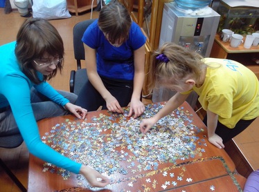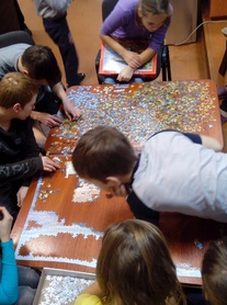 После чая взялись за очень сложную задачу – сложить пазл из 2000 частей. Практически все, включая малышей поучаствовали и подобрали хотя бы маленький фрагмент головоломки. Но, несмотря на все усилия, закончить до вечера нам не удалось, и ребята обещали собрать картину до следующего нашего приезда.