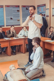 После экскурсии нас ждал мастер-класс по оказанию первой помощи пострадавшему. Это было очень интересно и познавательно. После этого нам предложили попить чай с угощениями. Всем сотрудником пожарно-спасательного отряда 209 огромное спасибо! Пообедали в ресторане «Веранда» и пошли в кукольный театр на очень интересный спектакль «Божественная комедия». Многие слышали об этом спектакле и очень хотели побывать на нем. Это был не скучный, с юмором спектакль, который очень многим понравился. |
