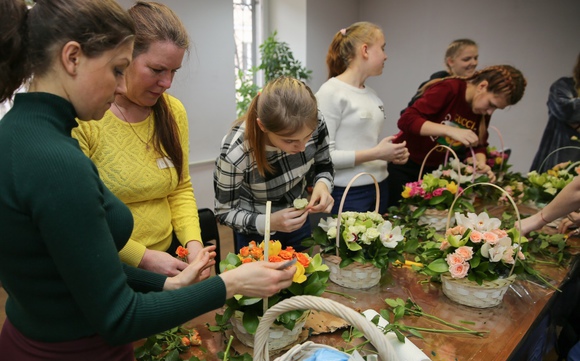Начали осваивать в первый же день. Девочки посетили мастер-класс по флористике – учились собирать красивые букеты в корзинах. Флористы Надежда и Инна сразу предупредили: быть флористом – это не только создавать красоту и любоваться цветами. Иногда приходится таскать тяжелые сумки и делать разную черную работу. Поэтому присутствующим мужчинам было строго-настрого запрещено помогать, и мастер-класс начался с разминки – девочки сами выгружали из машины и относили в зал цветы, корзины, инструменты и все необходимое. Ну а после были два часа чистого творчества. Одна из участниц, Таня, обожает цветы, и попробовать себя в деле была ее мечта. После мастер-класса Таня убедилась, что именно флористике она хотела бы обучаться в будущем.