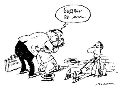 Не все, конечно, столь самонадеянны, многие честно учатся, но есть и великие фантазеры. Именно они проводят колоссальные по своему размаху праздники непонятного содержания, бюджет которых сопоставим с годовым бюджетом какого-нибудь регионального департамента образования, и на которые, как в резервацию, сгоняют сотни детей-сирот; они раздают привокзальным бомжам деньги, на которые те немедленного и с удовольствием покупают слабо и сильно алкогольные напитки; они привозят в детские дома компьютеры под лозунгом, что они, безусловно, входят в список того, на что современный ребенок имеет законное право, и не заботятся об образовательных программах, фактически, ограничивая их применение, в лучшем случае, игрушками-стрелялками. И так далее и тому подобное. Засада состоит еще и в том, что часто подобные благотворители делают ошибочные выводы о правильности выбранной ими стратегии, исходя из того, что объект помощи ее принимает, а не отказывается. Конечно, и бомж деньги возьмет, и детдомовский ребенок доступу в Интернет обрадуется, но делать заключения на таком уровне поверхностно, а иногда и преступно.