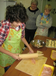 Из актового зала мы перешли на кухню и начали готовить с Лёшей. Сегодня решили делать пирожки и пиццу, а чтобы веселей было готовить, мы придумывали продуктам другие названия на тему «пятницы 13». Начинка в пирожках была из летучих мышей, тесто назвали мозгами троллей. Были ещё галлюциногенные грибы (шампиньоны), жуки (маслины) и др. А затем мы всё это съели!