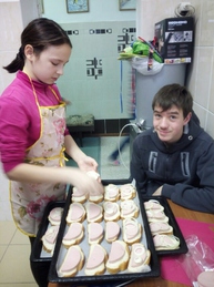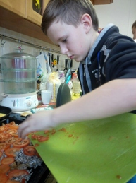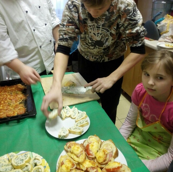 Когда продукты принесли все начали спрашивать у Лёши, что им делать, и он каждому помог найти занятие. Работа закипела. Запекали куриные грудки с грибами, помидорами и сыром. Ещё делали рулетики. Ребята всё запомнили и делали сами от начала и до конца. Оставалось ещё время, и мы решили сделать горячие бутерброды. А затем, как всегда, начался пир!