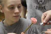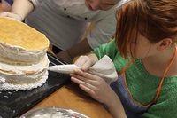 После обеда Лёша неожиданно подарил всем девочкам по розе. Затем стали из коржей создавать торт: собрали, смазали, украсили. Многие тренировались делать розочки из крема, а Оксана и Катя даже научились их делать. Катя ещё записала рецепт этого торта.