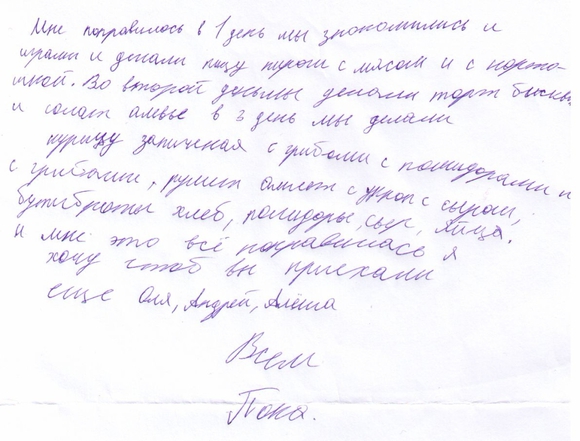 Пришли все воспитатели и педагоги, пробовали и очень хвалили. Одна из воспитателей спросила рецепт, и Стас, Карина и Сережа ей всё сами продиктовали без нашей подсказки! Мы решили, что таким образом они сдали экзамен. До отъезда всё помыли и убрали на кухне и снова сыграли в «Мафию». Когда пришло время уезжать, все долго обнимались, и мы договорились о встрече 2 марта в компании Nestle, где ребят ждёт продолжение программы.